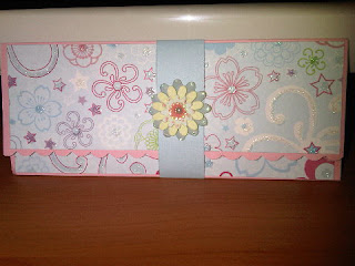 My project for today is a Money Holder. I made this using the instruction from dawn 5377 (youtube name), you can wacth her video here. It´s super simple. I use some pink and blue cardstock and DCWV Posies glitter print and the flower is from K & Company, Classic K. Bailey. I hope you have a great week.