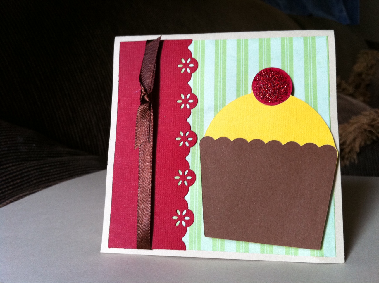 Hello, crafty friends, today I want to show my entry for the Cupcake challenge that Mary has at her blog, Cardz Tv. I use my Sweet Treat Cartridge for make the cupcake, at 3". The card base is 4x4; the green line paper is from DCWV Summer Dream stack, cut a 3 3/4" x 3 3/4"; the red cardstock is from bazzill cut a 2" and I trim the border using my Fiskar border punch. On the cherry, I put some glitter. Thanks for visit me,